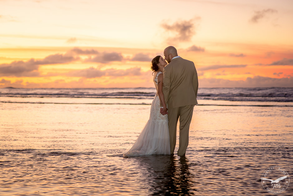 Kaeli & Greg tied the knot on a mesmerizing evening out at Ke’e beach. Just the two of them on the breathtaking coastline of this small Pacific island. Their officiant, wonderful Kahu Chuck, performed a heart warming ceremony to marry the beautiful couple. The weather was perfect, mostly sunny, with little drizzle to bring out a double rainbow and enough clouds to light up the sky at sunset. The ocean was as calm as I have ever seen in the winter and Kaeli & Greg had no hesitation stepping into the water. One of the most stunning sunsets I have seen in a while and the photos came out great. There is not much more a Kauai wedding photographer can hope for. A perfect evening!